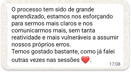 Para que o processo funcione, é importante que ambos estejam dispostos a participar e a se envolver. Não é sobre apontar culpados, mas sobre construir novos caminhos na relação - com mais escuta, compreensão e cuidado mútuo.
